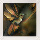 Eine futuristische digitale Darstellung eines Kolibris in weichem Gold, Grün und Blassorange mit fantasievollen Flügeln und Heckfedern. Fantasievogel von Kat McCarthy