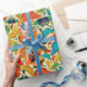 Schmetterlingsliebhaber erfreuen sich in diesem Papier, das mit Schmetterlingen in den Schatten des Blaus, des Goldes und des Rotes auf einem beige Hintergrund bedeckt wird.