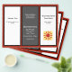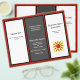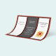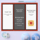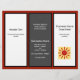 Broschüre für Business Flyer in Schwarz, Rot und Weiß mit sechs Textanzeigern, beiderseits mit 8,5 x 11 Zoll Papier. Auf der einen Seite befinden sich zwei weiße Paneele mit einem dunkelgrauen Paneel in der Mitte. Der Hintergrund ist dunkelrot. Diese Seite wird die Außenseite der Broschüre sein, wenn sie gefaltet ist. Fügen Sie der Titelseite mithilfe der Vorlage ein Logo hinzu. Auf Seite zwei befindet sich der Text für die Seiten, zusammen mit einem Ort für einen QR-Code. Das Zentrum ist für einen "Über" Abschnitt.