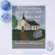 Digitaler zeichn einer kleinen Landkirche, klarer blauer Himmel, ein Baum auf grüner Rasenlandschaft.