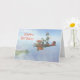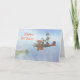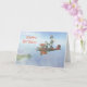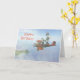 Eine Geburtstagskarte mit einem Skelett, das Ass fliegt und ein kleines Zweiflugzeug pilotiert.