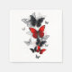 Fliegende Fliegenschmetterlinge, realistisch, rot und schwarz Morpho auf weißem Hintergrund mit Farbtropfen.