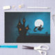 eine Hexe, die auf ihrem Besenstiel vorbei am Vollmond fliegt, mit einem dunklen Haus im Hintergrund und einer Katze auf dem Zaun 100% Anpassung. Klicken Sie auf die Schaltfläche CUSTOMIZE, um einen der Schriftart oder Grafiken hinzuzufügen, zu verschieben, zu löschen, zu verändern oder zu verändern.