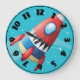 Träumen vom Überfliegen durch den Weltraum in einem Raumschiff. Nun, dieses Design wird diesen Traum erfüllen. Es ist von einem bunten Raumschiff, das durch den Weltraum zieht. Die Rakete ist mehrfarbig und hat einen Dampfweg auf der Rückseite. Es ist Set vor einem blauen Hintergrund. Dieses fliegende Raumschiff sieht auf dieser Uhr großartig aus. Perfekt für sich selbst oder als Geschenk