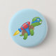 Abenteuerliche Schildkröte mit einem roten Raketenrucksack und einer Vogelbrille fliegt mit einem glücklichen Grinsen.