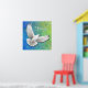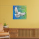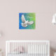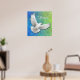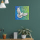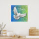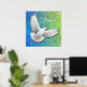 Originelles Kunstdesign einer fliegenden weißen Taube vor einem hübsch blauen grünen Hintergrund des Künstlers Carolyn McFann von Two Purring Cats Studio, gedruckt auf einem hochwertigen Plakatdruck.