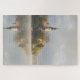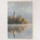 Puzzle mit vertikalem Foto und nebelhaftem Sonnenaufgang am frühen Morgen mit Nebel über dem Wasser und Reflexion im Wasser der Kirche auf der Insel Bled, Slowenien.