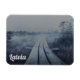 Nebel über dem Bug mit Holzweg, kleinen Teichen und Kiefern. Wanderweg mit Holzweg, der über den Moor führt.