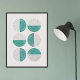 Dieser moderne Kunstdruck weist eine Reihe von Kreisen auf, die in zwei Hälften geteilt sind und durch kurvilineare und gerade Linien aufgeteilt sind. Die solide Hälfte jedes Kreises ist eine lebendige aquamarine Farbe, während die andere Hälfte in Gold oder Silberfolie gepresst wird. Dieses Design ist vielseitig genug, um mit verschiedenen Dekorstilen zu arbeiten, aber ich denke, es würde in einem Büro oder Loft gut aussehen.