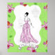 Ein lebendiger Blumendruck beleuchtet eine elegante Kleiderin in einem lila Ballgown.