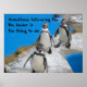 Digitale Fotografie von 3 Pinguinen, die auf einem Spaziergang in ihrem Zoo-Lebensraum herumtoben. Mit dem Titel: "Manchmal ist es das Richtige, dem Anführer zu folgen!"