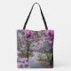 Ihre Auswahl an stilvollen Totentaschen oder Kreuzkörpertaschen mit einem Überdruck, der das Foto eines botanischen Gartens mit einem von schönen, rosa Rhododendron-Blume gesäumten Weg zeigt, sowie ein inspirierend/motivierend Zitat, das lautet: "Folge deinen Träumen". Ein schönes, blumengeschmücktes Design! Wählen Sie Ihre Tasche Stil und Größe.