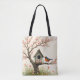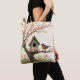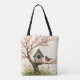 Ein roter und schwarzer Vogel ragt in einem kleinen Baum vor einem rustikalen Vogelhaus auf dieser niedlichen Totentasche im Volkskunststil. Ideal für alle, die Vögel, Natur und die Natur im Freien Lieben.
