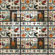 Dieser Stoff zeigt ein von Volkskunst inspiriertes Muster mit Herbst- und Naturmotiven, die in rustikalen Fliesen angeordnet sind. Pumpkins, Eichenfische, Blumenzweige und Vögel - einschließlich eines raven und faszinierenden Vogels - tauchen überall neben Sternen, Diamanten und Herzakzenten auf. Das Muster wurde im Stil von Appliqué und Stickerei erschaffen und verwendet warme Erdtönen in Orange, Braun, Rot, Grün und Creme, die den Geist des Herbstes wecken. Ideal für die Dekoration von Bauernhäusern, primitiven amerikanischen Stil, Erntezeit-Kunsthandwerk und rustikale Volkskunst-Liebhaber.