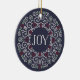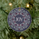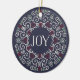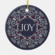 Das schicke und fröhliche Urlaubsdesign "JOY" umrahmt von einer volkstümlichen Medaillonillustrierung in Elfenbein, Cranberry und Salbei grün, auf einem tiefen Mitternachtsblauen Hintergrund für einen schönen Kontrast. Das Ornament kehrt in das gleiche Medaillondesign zurück, mit Ihrem ersten, Familiennamen und dem Jahr in der Mitte.