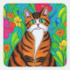 Folk Art Orange Cat und Blume Quadratischer Aufkleber
