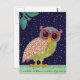 Farbenfrohe Folk Art Muster Owl bei Nacht, mit calico, polka Punkt und Text-Druck Muster einer Eule mit großen Augen mit Mitternachtsschneefall im Hintergrund.
