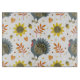 Blaugraue Puten, goldene Sonnenblumen und Eichen, orangefarbene Herzen und Blätter vor weißem Hintergrund