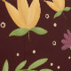 A charming pattern of seated orange foxes surrounded by yellow and purple flowers, green leaves, and dotted accents on a rich burgundy background.