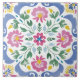 Ein quadratisches Keramikfliesen-Design mit volkstümlichen botanischen Illustrationen. Jede Fliese zeigt ein symmetrisches Gartenmotiv – Lilien, wilde Beeren und wuchernde Ranken – in weichen Aquarelltönen. Das Kunstwerk imitiert eine handbemalte Glasur mit beabsichtigten "ausgebluteten" Rändern und einer subtilen rissigen Keramiktextur (Craquelure) für ein rustikales, traditionsreiches Gefühl.