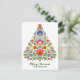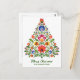An der Vorderseite der Postkarte befindet sich ein blendender Weihnachtsbaum, der in Richtung Himmel reicht, mit Ästen, die in einer Symphonie lebendiger Farben verziert sind. Jeder Zweig ist sorgfältig mit kunstvoll geschnittenen Ziergegenständen dekoriert, die Szenen aus wertvollen Folkloregeschichten zeigen. Der Baum steht hoch vor einem Hintergrund tiefer Blues und Purpur, was den mystischen Reiz des Nachthimmels widerspiegelt. Zu seiner Basis serviert eine Familie von Künstlern in traditioneller Lowicz-Kleidung die Saison mit fröhlicher Musik.