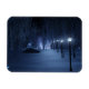 Ein schneebedeckter Weg, der sich in einer dunklen Winternacht durch den Birkenwald schlängelt. Der Weg ist von Laternenpfählen gesäumt, die ein silberblaues Glühen verleihen, aber im Schatten sind die Formen, wie kleine Lichter aus Märchen, hell und verleihen dem Reisenden den Weg. In der Ferne leuchtet der Lavendel einer geheimnisvollen Ansammlung des Waldes den kalten Himmel.