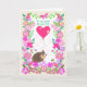 A pretty Valentine's Day greeting card for your Fiancee that features a cute, smiling hedgehog, carrying a big, deep pink, heart-shaped balloon. The front cover has a border of flowers of various kinds in shades of pink and there is also a pink butterfly, a bumble bee and a ladybird, enjoying the flowers, all on a white background. The front cover greeting is, 'To my dear FIANCEE in green lettering and the inside message is just a suggestion and you can easily change it - or delete it altogether - if you prefer a 'blank inside' card.