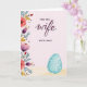 Designed with a soft watercolor look, this card centers on a romantic message where “FOR YOU” sits above and “WITH LOVE” sits below, while the word “wife” appears larger in deep berry lettering in the middle. Along the left edge, a flowing floral border spills downward with coral, fuchsia, and deep violet blossoms, tucked among teal and olive-green leaves and tiny ruby-red buds 🌷. The background fades from blush pink at the top into sandy beige at the bottom, like early morning light settling over a quiet scene. The gentle contrast between the smaller, simple lettering and the larger berry word gives the message a tender, devoted focus without crowding the artwork. Warm golden-yellow flowers peek through the bouquet, adding a friendly glow that feels like an affectionate glance shared between close partners. Near the bottom right, a robin’s egg blue oval ornament adds a festive touch, balancing the heavy florals on the opposite side 🐰. Its surface is traced with fine white vine-like swirls and curving patterns that stand out against the cool blue.