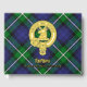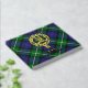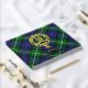 Clan Forbes Wappen Abzeichen umgeben von einem Gurt und Schnallen über Tartan Hintergrund. Benutzerdefinierter Vorder-, Rücken- und Rückentext.