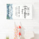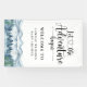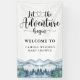 Lass das Abenteuer beginnen rustikale Waldabenteuer Thema Blue Water Color Baby Dusche Banner mit Wald- und Bergwildlandschaft und Kalligraphie Skript Typografie mit Herz in der Mitte.