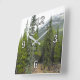 Dieses quadratische Uhrendesign besticht durch ein Foto einer Waldszene mit Nadelbäumen und einen Berg im Hintergrund. Es enthält auch Zahlen, die die Stunden "12", "3", "6" und "9" markieren.