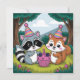 An adorable baby's first birthday invitation with a forest animal theme. A cute raccoon and squirrel holding a blackberry cupcake wearing birthday hats.