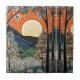 Dieses bezaubernde Bild zeichnet sich durch ein Jugendstil-Fliesendesign aus, das das Wesen eines bezaubernden Waldes einnimmt. Im Mittelpunkt steht ein großer, stilisierter Sonnenuntergang oder ein Aufstieg hinter sanften Hügeln, die in Blau- und Grüntönen dargestellt sind. Der Himmel ist eine lebendige Orange mit weißen, wirbelnden Mustern und Punkten, die Sterne oder Schneeflocken darstellen. Bäume mit aufwändigen Blattmustern umrahmen die Szene und fügen Tiefe und Interesse hinzu. Im Vordergrund bilden verschiedene Pflanze und Blume mit detaillierten Texturen einen reichen Naturteppich. Der Gesamteffekt ist eine mystische Schönheit, die natürliche Elemente mit dekorativer Kunst verbindet.
