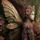 Eine Fee, die mit sanften Blütenblättern und schimmernden Flügeln in Rose eingezogen ist. Ihre Kleidung leuchtet, als ob sie von sanftem Mondlicht beleuchtet würde, was ein Gefühl von Ruhe, nächtlicher Verzauberung hervorruft. Ideal für eine Vintage oder schlichte Dekoration.