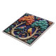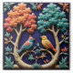 Keramik Kachel mit zwei bunten Vögeln in einem Wald, sitzend auf bunten stilisierten Bäumen, auf einem dunkelblauen Hintergrund.