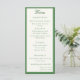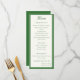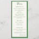 Design front features a pale-cream background to your customizable text. Heading is displayed in an elegant font in top center. Following the traditional format for a wedding menu, all text is customizable and displayed in a forest-green colored Nuptial font. Entire design is framed by a forest-green and pale-cream border.