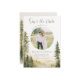 Fotograf Christliche Hochzeit Save the Date-Karte zeigt eine einfache Natur Aquarell-Design inklusive Waldkiefern und Bergen in Erdtönen von Salbei, Grün und Bräune. Im Hintergrund steht ein inspirierendes Zitat zur Hochzeit: "Zwei Leben vereint in Freundschaft, zwei Freunde in Liebe vereint, Eine Liebe vereint in Christus."