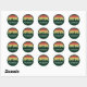 Cool passender Familienstopp-Wiedersehen-Aufkleber in grün für die ganze Gruppe auf einem Naturausflug oder Camping. Dieses Gastgeschenk-Siegel oder Mailing-Label an Siegel ein Umschlag bietet einen schönen Vintagen Sonnenuntergang über einem Wald von hübschen Bäumen über Ihrem personalisierten Text.