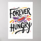 Ein lustiges handgeschriebenes Typografie-Poster mit dem Satz "Forever Hungry" in spielerischer skizzenhafter Kalligrafie. Ein perfektes Stück Wandkunst für Küchen, Speisebereiche, Restaurants oder als ein humorvolles Geschenk für die Liebhaber der Küche.