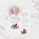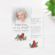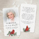 This heartfelt memorial prayer card features a cherished photo paired with the comforting sentiment Forever in Our Hearts and a symbolic red cardinal resting on evergreen branches. Known as a sign of love and remembrance, the cardinal adds meaning and warmth to this design. The back includes a gentle message of comfort and reflection, making this card a meaningful keepsake to share at a funeral, memorial service or Celebration of Life as loved ones honor a life that continues to live on in memory.