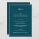 This formal wedding menu card features an elegant script heading, clean serif typography, and a classic border on a deep teal background for a timeless reception look. The structured layout presents each course clearly while adding a refined, cohesive touch to table settings or place settings. Designed to coordinate seamlessly with classic and black-tie wedding stationery, it elevates the overall tablescape without feeling busy. Ideal for couples who want reception details that feel polished, organized, and enduring.
