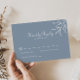 Diese offizielle, minimalistisch blaue Hochzeitskarte ist perfekt für eine rustikale Hochzeit. Das Design umfasst Wildkräuter in Aquarelltönen in einem staubigen blauen Hintergrund.