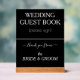Das offizielle Gästebuch für Hochzeiten bitte unterschreiben ist oben in Weiß vor schwarzem Hintergrund geschrieben. Vielen Dank von der Braut und Bräutigam ist in Drehbuch und elegante schwarze Typografie geschrieben. \Minimalistische Hochzeitsempfangsanzeige. Entwürfe von TamiraZDesign.