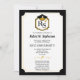 Das elegante und formale Weiß auf schwarz, goldfarben und silberfarben Abschluss Ankündigung und Begrüßungszeremonie mit einem Top-Mittelemblem für die Monogramm-Initialen Ihres Grades mit einem Graduiertenmütze oben. Sie können sich einfach mit den Details Ihres Lieblings-Absolventen personalisieren - alle Felder können nach Wunsch modifiziert werden. Originelles Design von Holiday Hearts Designs (Rechte vorbehalten).