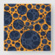 Ein lebendiges Muster zeigt eine Reihe miteinander verbundener dunkelblauer Kreise Set vor einem hellen orangefarbenen Hintergrund und schafft einen auffälligen Kontrast. Die überlappende Anordnung gibt ein Gefühl von Tiefe und Bewegung. Illustration Design von trippigen abstrakten orangen und blauen Lavaschlauchlöchern. Tags: abstrakt, Punkte, geometrisch, verrückt, orange, blau, halluzinogen, Löcher, psychedelisch, Lava, Trippy, Trypophobie