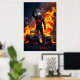 A Formula 1 driver in a Red Bull racing suit stands triumphantly on his car amidst a dramatic explosion of fire and smoke. Clear details and vibrant colors enhance visual appeal.