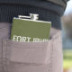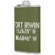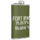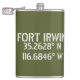 Längen- und Breitengradkoordinaten für Fort Irwin - in der Wüste in der Nähe von Barstow, Kalifornien Flask, mit einem weißen Schriftart im Schablonenstil auf army-grünem Hintergrund.