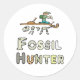 Fossil Hunter Grafik zeigt einen scharfen Sammler, der einen Teil eines Fossils untersucht, wobei die Reste noch unter Boden begraben sind. Unten sind die Worte "Fossil Junter" mit den Buchstaben gelegentlich gebrochen wie ein Fossil könnte sein. Ein lustiges Design für Fossilienjagdfans.