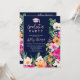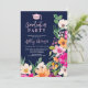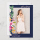 Rufklasse 2024! Elegante, helle und kühne moderne Sommer-Blume Illustration mit hübscher überdimensionaler Blume und Pinsel Drehbuch Garten Graduation Party mit einer modernen Kalligraphie Typografie mit leuchtend neonrosa, orange, grün und gelb Blumen auf marineblarem Hintergrund. Fügen Sie Ihr Foto hinten hinzu.