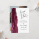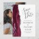 Diese elegante, moderne Save the Date-Karte verfügt über eine bordeauxrote Aquarellfarbe, die mit Imitaten silbernen Glitzer bestickt ist. Der anpassbare Text ist kohlegrau auf einem weißen Hintergrund. Ersetzen Sie das Beispielbild auf der Rückseite einfach durch ein vertikales Foto der zukünftigen Braut und des Bräutigams.